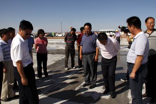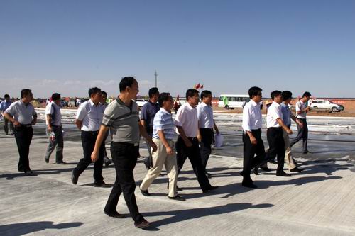 8月21日,由喬新山局長率領(lǐng)的民航西北管理局工作檢查組一行蒞臨金昌機(jī)場飛行區(qū)施工現(xiàn)場檢查指導(dǎo)工作。在飛行區(qū)停機(jī)坪建設(shè)工地,在了解到公司金昌機(jī)場項目部僅用了二十五個晝夜完成了總面積2.65萬平方米停機(jī)坪道面工程的情況后,對大家的辛勤勞動給予了充分肯定,并鼓勵廣大建設(shè)者繼續(xù)鼓足干勁、克服困難,發(fā)揚(yáng)求真務(wù)實、艱苦奮斗的作風(fēng),確保工程按期完工。
