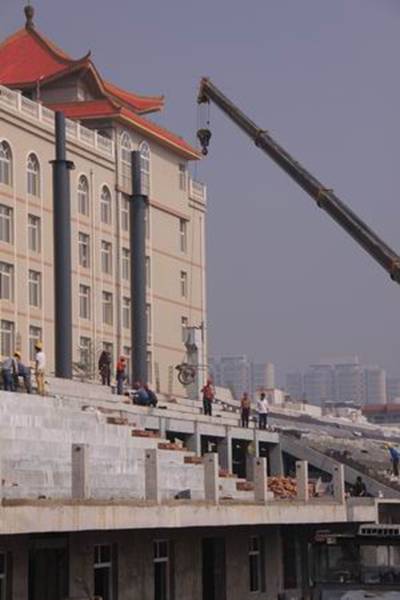 圖3為繁忙的看臺(tái)吊裝施工的場(chǎng)景