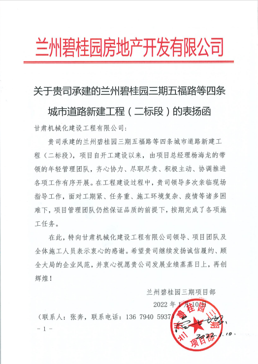1月10日,我公司收到來自蘭州碧桂園房地產(chǎn)開發(fā)有限公司的表揚(yáng)函,函中提到,蘭州碧桂園三期五福路等四條城市道路新建工程(二標(biāo)段)項(xiàng)目自開工建設(shè)以來,項(xiàng)目人員面對工期緊、任務(wù)重、施工環(huán)境復(fù)雜、疫情等諸多困難,在保證品質(zhì)的前提下,按期完成了各項(xiàng)施工任務(wù),提出表揚(yáng)。