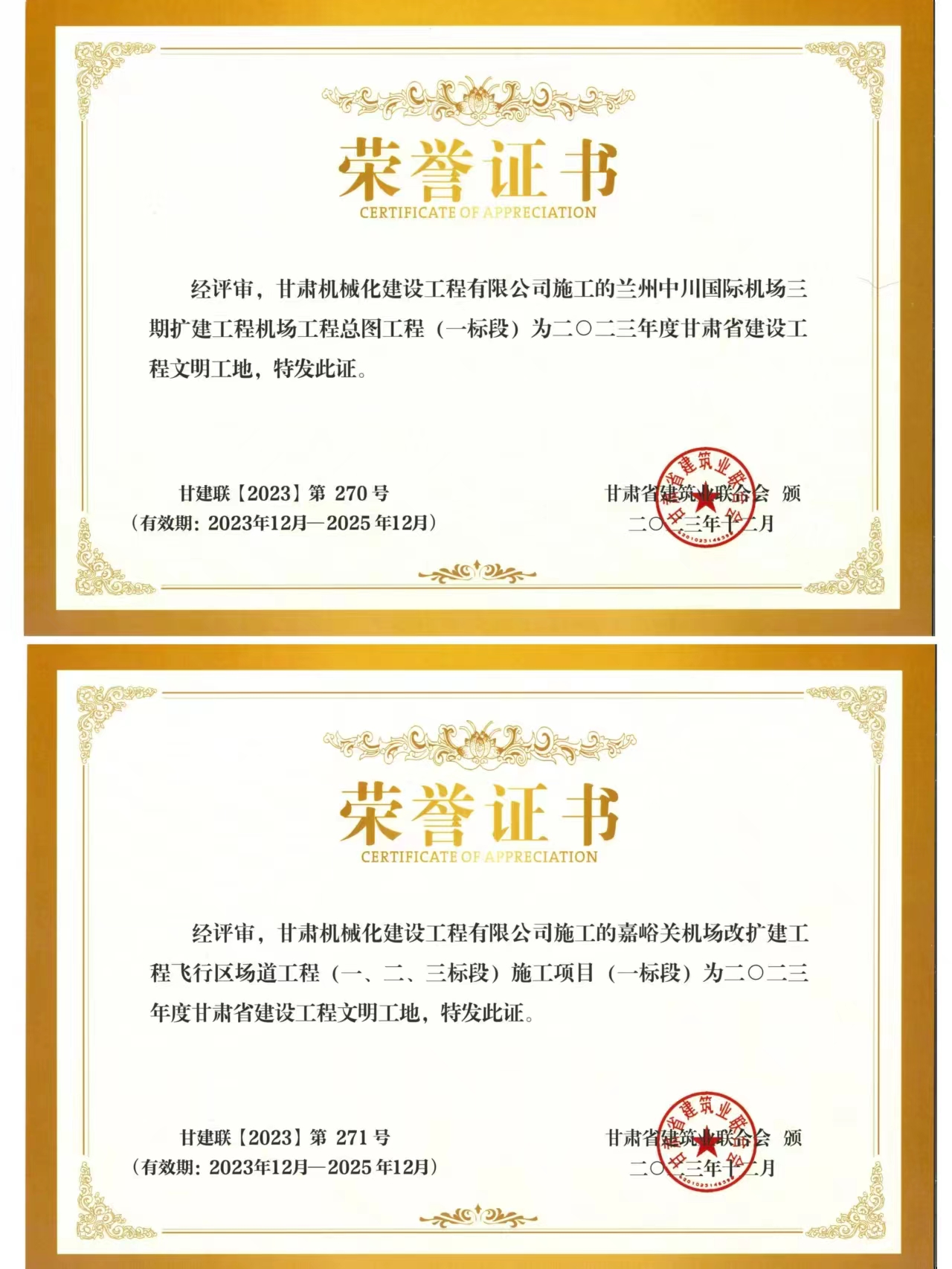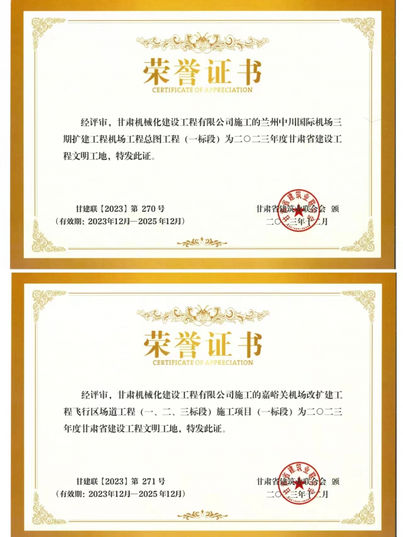 近日,我司承建的蘭州中川國際機場二期擴建工程機場工程總圖工程 (一標(biāo)段)與嘉峪關(guān)機場改擴建工飛行區(qū)場道(一、二、三標(biāo)段) 施工項目 (一標(biāo)段) 獲得2023年度甘肅省建設(shè)工程文明工地榮譽稱號。
